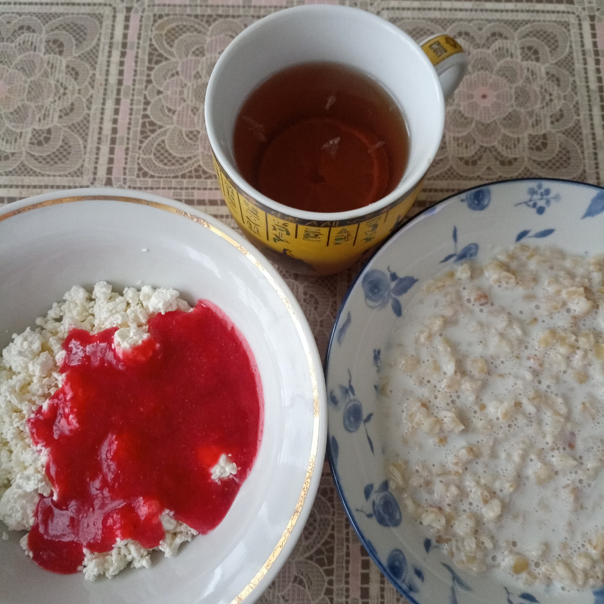 Завтрак был такой. Каша, как всегда, ещё доела творог и чай с лимоном. Без всяких печенек обошлась.