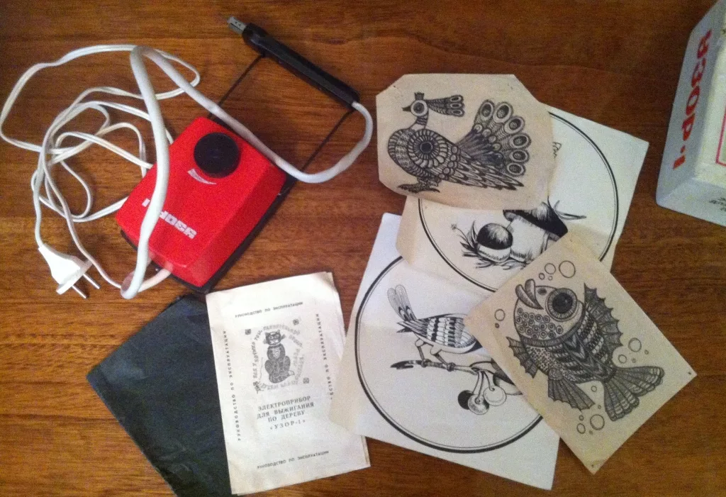 Моделей выжигателей в те годы было немало, но особенно популярными считались приборы с говорящими названиями — «Узор», «Орнамент», «Вязь». Стоили они чуть больше четырёх рублей и продавались целыми наборами: сам прибор, сменные насадки и дощечки с уже нанесёнными шаблонами или эскизами.