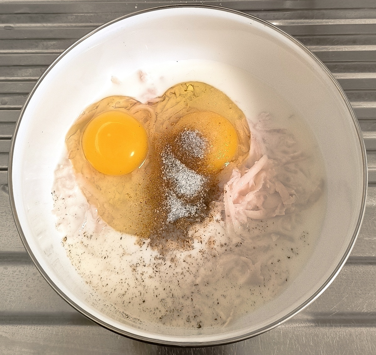 В миске взбейте яйца с молоком, ветчиной и специями.