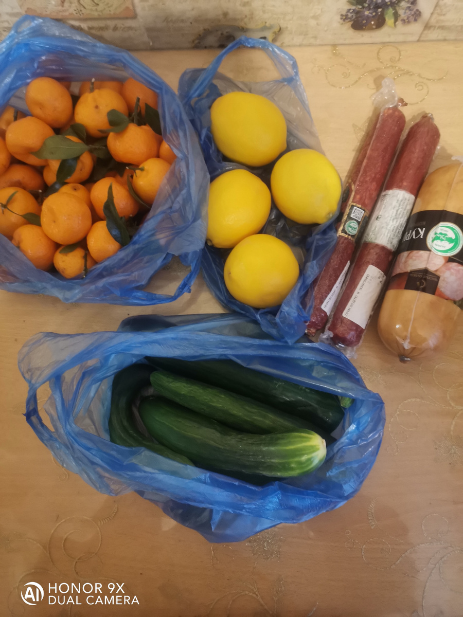 Привет всем! Осталось совсем немного выходных дней и вновь рабочие и учебные будни. Время пролетело молниеносно,вроде бы ничем особенным не занимались,а время как стрела. Сегодня на улице совсем тепло,-4. Сначала мы заехали к родственникам,а после решили съездить на базу за картофелем. Но по пути еще заехали на базу на Комсомольской,там мы давно не были и раньше мы там тоже покупали колбасные изделия,причем там была сырокопченая халяльная колбаса и что то мне так захотелось,я ее люблю с детства. Я конечно этого случая не помню,но мне рассказывали,что когда мне было 2 годика,дедушка у меня работал директором завода"Промсвязь",и конечно же он доставал эту колбасу. И каждый раз при любом застолье мне давали большой кусок этой колбасы,вот видимо любовь и возникла))) А потом дедушка ушел с работы,а папа с мамой остались работать на данном заводе до своей пенсии. Этот отдел сохранился и мы купили две палки сырокопченой,одна по 1060 за кг,вторая 1120 за кг,конечно мы отдали не такие деньги,там же не киллограмм и взяли рулет,вообщем нам это обошлось 990 рублей. Затем мы поехали на четвертую базу и там купили картошку по 25 рублей за килограмм,в тот раз купили дешевле,но она мне не понравилась. И там купили немного абхазсхих мандарин,лимон тонкокорый и огурцы. По пути домой заехали за лепешками и решили приготовить крутоб.