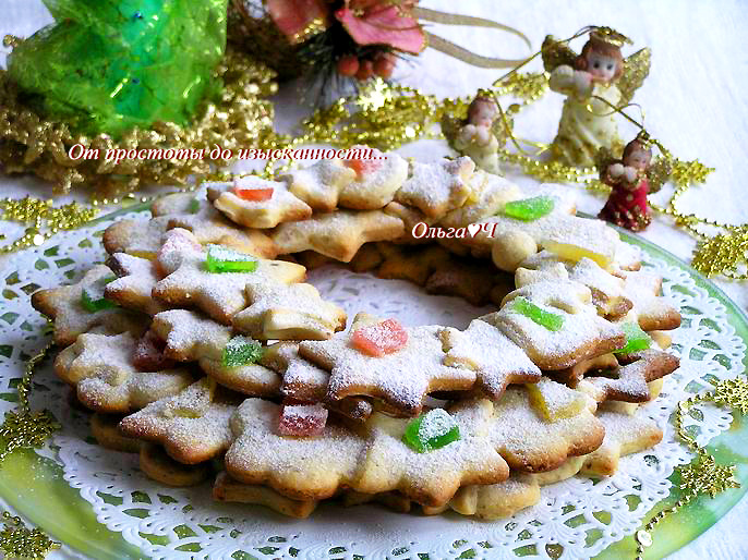 сахарная пудра для посыпки Приготовление: Разотрите сахарную пудру с размягченным сливочным маслом. Добавьте яйцо и измельченный миндаль, перемешайте. Всыпьте муку с разрыхлителем и солью. Замесите тесто, заверните в пищевую пленку и уберите в холодильник на 1 час. Тесто раскатайте, вырежьте любые фигурки. Разложите печенье друг на друга в виде колец, выпекайте при 190*С около 15 минут. Каждый венок из печенья украсьте кусочками мармелада и посыпьте сахарной пудрой. А несколько венков разного диаметра можно уложить друг на друга. Приятного аппетита! Вам также могут понравиться: