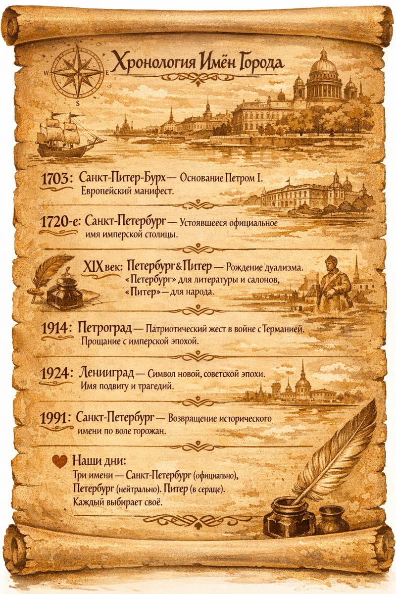 Но у города есть душа, которая живёт не в парадных залах, а в дворах-колодцах и в разговорах друзей. И эта душа говорит коротко и ясно — «Питер». Это имя родилось как народное, просторечное сокращение ещё в XIX веке и прошло через все испытания XX века.