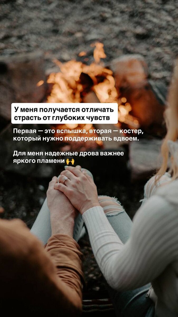 1️⃣У меня получается отличать страсть от глубоких чувств. Первая — это вспышка, вторая — костер, который нужно поддерживать вдвоем. Для меня надежные дрова важнее яркого пламени