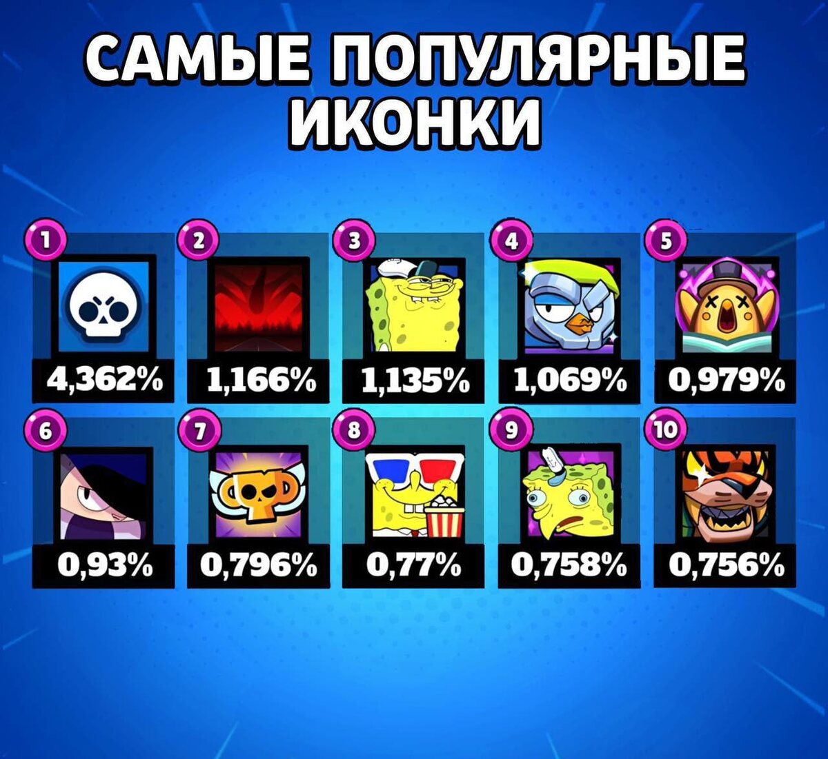 Перед вами топ-10 самых популярных иконок профиля. Базовую иконку с черепом выбирают целых 4,56% игроков. В топе сразу три иконки Спанч Боба — над косметикой в коллабе явно постарались. Иконка Эдгара тоже в списке, от него никуда не деться. ✅Новости по Clash Royale - ТЫК 💬Новости по Roblox - ТЫК ✅ БЕСПЛАТНЫЙ ПИН - ТЫК Мир Supercell. Подписаться