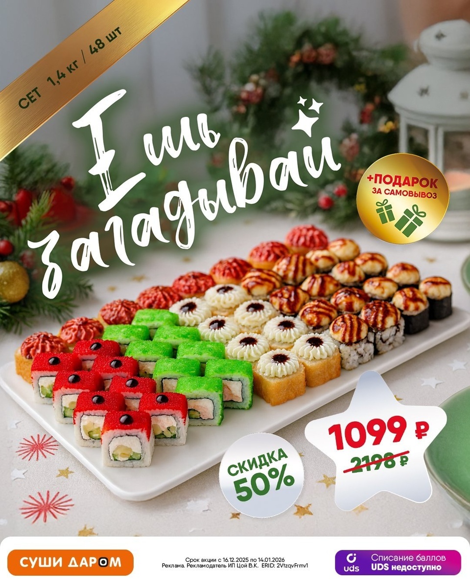 🥘 👌❤️🤩😁💛😱😍😎 🎄 В Новый год — только вкусное волшебство! Для вас две супер акции: 🍣 Сет «Ешь — загадывай» - 48 роскошных роллов и 1,4 кг счастья для праздничного настроения! clck.ru/3QzBco 🥂 Сет «Антипохмельный» - скидка 50% 1,4 кг удовольствия всего за 1099₽ — чтобы праздник удался на все 100%! clck.ru/3QzBco Заказывайте онлайн или звоните — дарите себе и близким незабываемый вкус праздника! clck.ru/3QzBco ✨ 📶 Категория: Ресторан 🏢 Суши-бар "Суши Даром" 📍 г. Чехов, Улица Дружбы, 20 ⏱ Часы работы: 10:00 – 22:00 ⭐Разместить публикацию ⭐Поддержать голосом ✅ Где поесть, Чехов!? https://dzen.ru/id/670a701b353dbb6d0fb04a97 http://vk.com/gdepoestchekhov http://dzen.ru/gdepoestchekhov