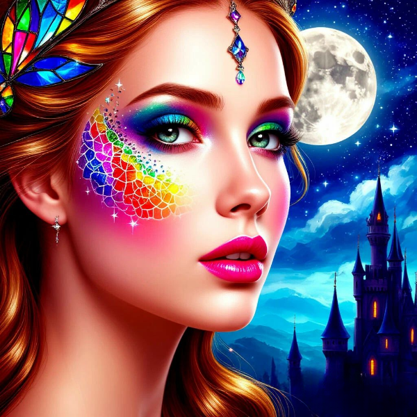 В самом сердце Хрустального королевства, где реки пели переливающимися мелодиями, а деревья росли из самоцветной пыли, жила принцесса Аглая. Но не жемчужная белизна её кожи или волосы цвета воронова крыла делали её особенной. На её щеке ,от скулы до виска, жил самый настоящий Витражик. Не родимое пятно, а волшебный, сияющий изнутри узор, будто собранный из тысяч крошечных стёклышек — алых, сапфировых, изумрудных и золотых. Когда Аглая улыбалась, Витражик играл на солнце, отбрасывая на стены весёлые
