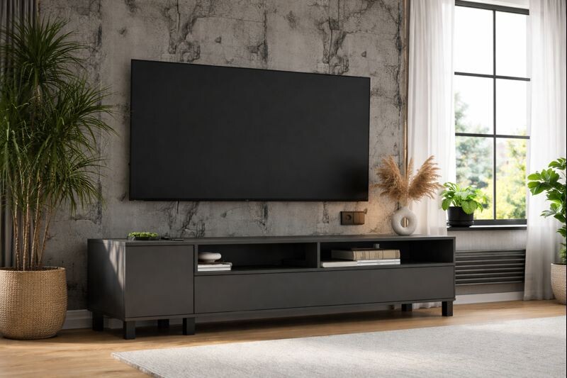 Формат 140 см хорошо подходит для большинства гостиных — тумба выглядит аккуратно и не перегружает пространство. PUSH-система позволяет открывать фасады без ручек, что особенно удобно в современных интерьерах.