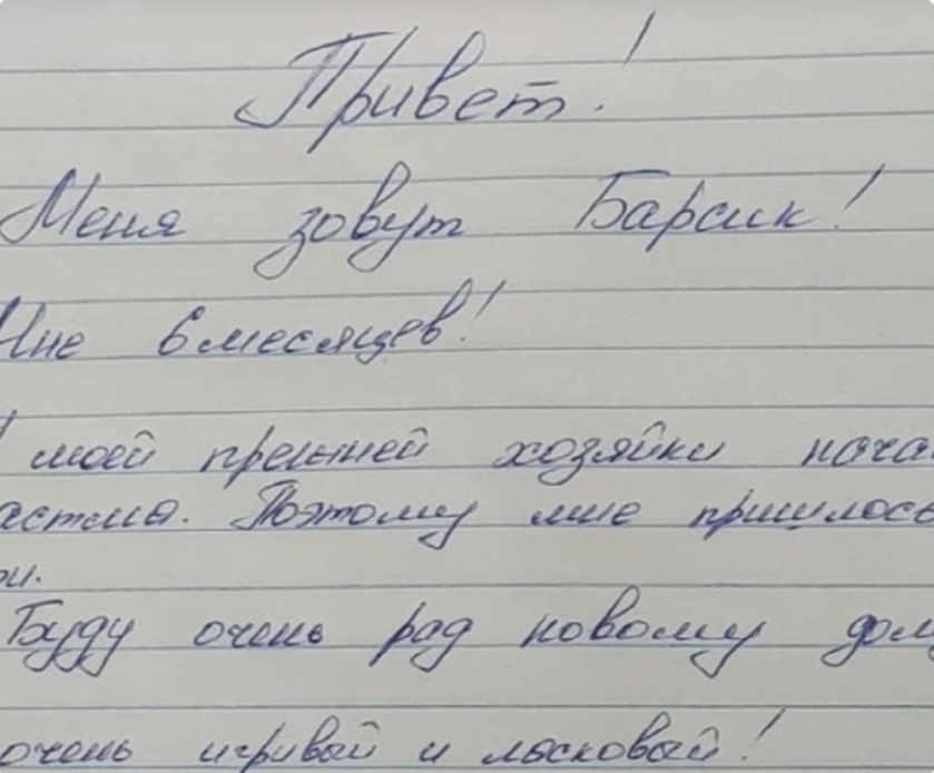 — Привет, я Барсик. Мне шесть месяцев. У моей бывшей хозяйки началась сильная астма, поэтому я был вынужден уйти. Буду сильно рад новому дому. Я очень игривый и ласковый.