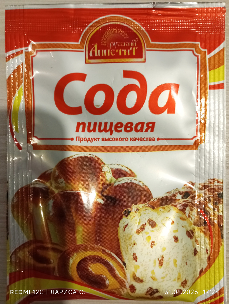 Соду в большой картонной коробке я использую для мытья посуды, для выпечки у нас вот такие пакетики.