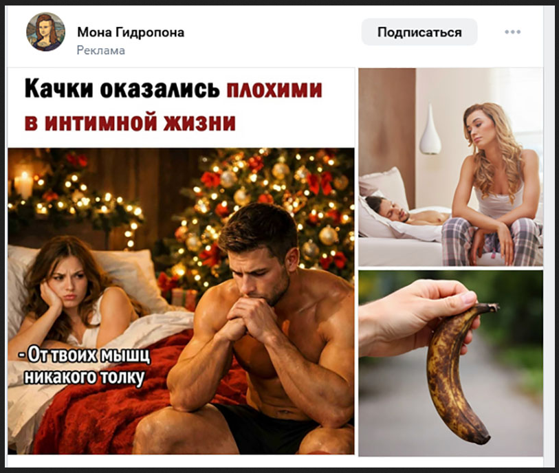 Сенсацию хотите? У качков в интимной жизни прямо-таки беда. Опять между ног всё отвалилось. И сплошные жалобы! Но откуда такая проверенная информация? Нет, это не комментарий одинокого обиженного качками диванного хомячка. И даже не комментарий какой-то обделённой самки пупырчатого ленивца. Нет! Это целая оплаченная кем-то пропаганда против бодибилдинга. А теперь внимание: ныне рекламируемый пост в ленте ВК. Автор «Мона Гидропоника» разместила целую рекламу на ВК этого захватывающего по содержанию поста. Позвольте цитату. Кстати, автор "Мона" почему-то не указала, о каких именно "исследователях мужской потенции" идёт речь. Может, это известные британские учёные из секретного агентства Ми-6 во главе с Джеймсом Бондом или самое авторитетное в плане науки и открытий "Армянское радио"? Мона, почему без конкретики? Мне безумно интересно узнать имя каждого учёного. Кстати, вы обратили внимание на "главного качка, лицо бодибилдинга" на смонтированной автором картинке? "Стальной пресс и огромн