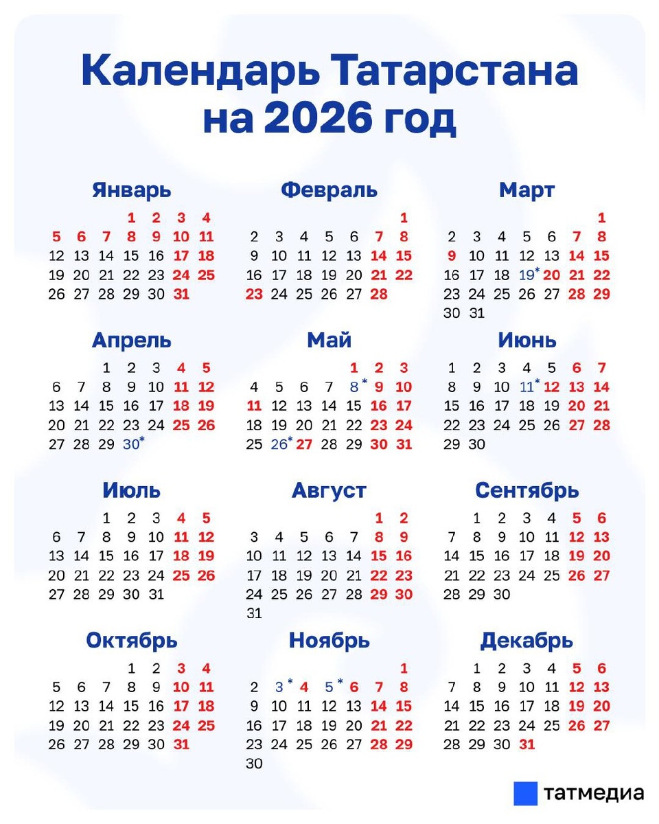В 2026 году жителей Татарстана ждет 244 рабочих и 121 выходной или праздничный день. Когда будут отдыхать татарстанцы в новом году и в какие месяцы выгоднее всего брать отпуск – в обзоре «Татар-информа». @tatmediaofficial | Все каналы Татмедиа ™️ 1-й новостной MAX-канал Татарстана - подпишитесь.