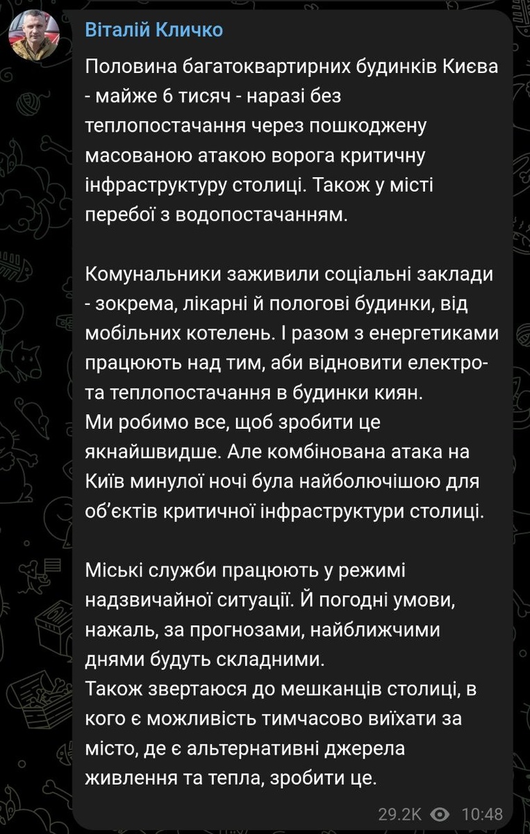 ⚡️Половина многоэтажек Киева (почти 6 тыс.) остались без отопления из-за ночной атаки, сообщает мэр Кличко