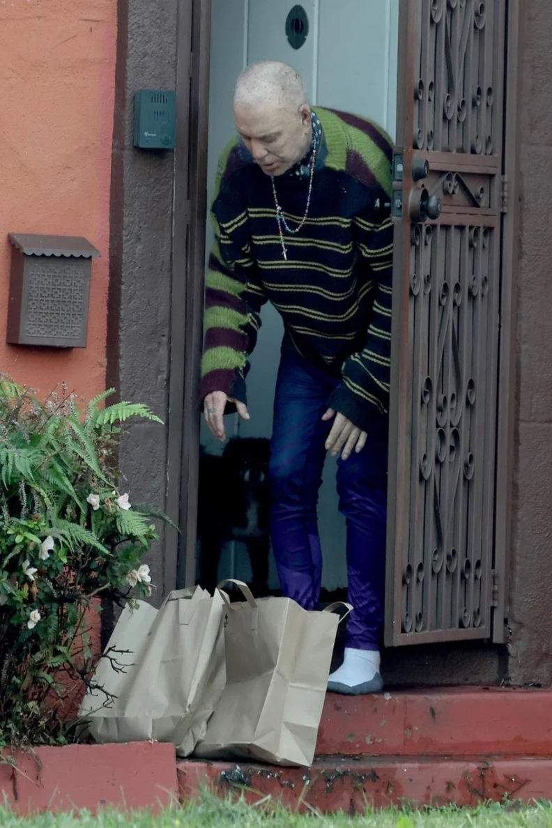 73-летний Рурк открыл входную дверь, чтобы забрать несколько пакетов с доставки. На снимках папарацци актер продемонстрировал выбритую голову.