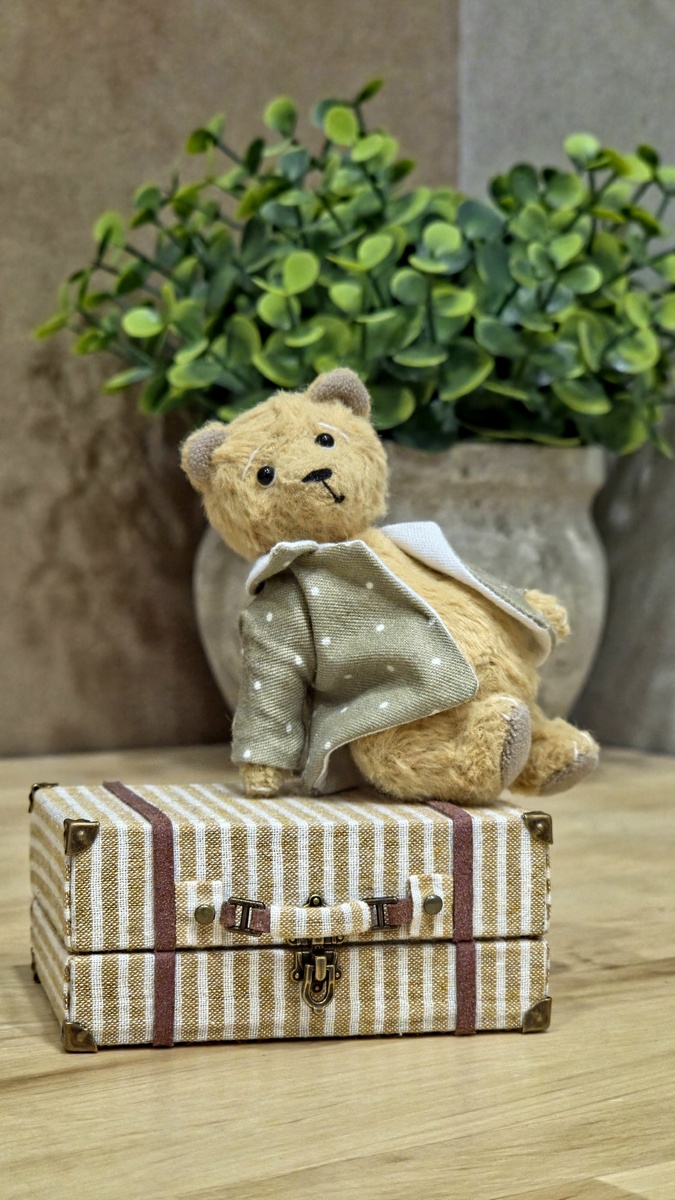 Этот мишка особенно любит пятницы. Он уже сложил все заботы в чемодан, сел сверху и решил: дальше- только отдых. Завтра выходной, можно никуда не спешить, пить чай подольше и думать о хорошем. Он просто ждёт момента, когда пятница окончательно станет субботой. Мишка: Рост 9 см, мишка прекрасно помещается в ладонь Весит около 26 граммов Подвижные голова и лапки, сидит сам, стоит с помощью Одежда снимается Материалы: вискоза, кедровые и можжевеловые опилки, стеклянные глазки, мулине, крепления (металл и пластик), нитки, стеклянный гранулят, ткань-хлопок, много любви) Рукодельники 0 постов • 0 подписчиков Подписаться Добавить пост Подробнее о правилах