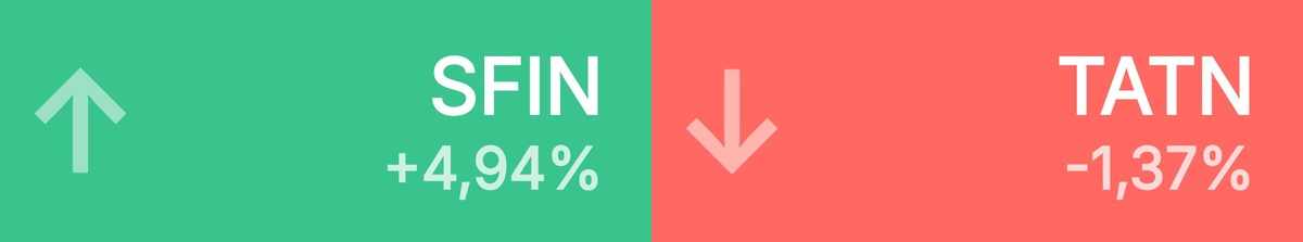 : ЭсЭфАй • 858 ₽ • 4,94% ЮМГ • 835 ₽ • 2,29% АФК Систем • 12,97 ₽ • 1,60% Медикал Гр • 1 535 ₽ • 1,49% ТГК-1 • 0,01 ₽ • 1,28% Озон • 4 350 ₽ • 1,26% Алроса • 41,18 ₽ • 1,23% Мосбиржа • 173 ₽ • 1,23% ЭЛ5-Энерго • 0,50 ₽ • 1,21% Аэрофлот • 57,24 ₽ • 1,17% 🔻 Топ-10 лидеров падения среди крупнейших акций: Татнефть • 562 ₽ • -1,37% М.Видео • 77,45 ₽ • -1,15% Татнефть п • 527 ₽ • -1,14% РусГидро • 0,42 ₽ • -0,96% Мосэнерго • 2,17 ₽ • -0,94% VK • 291 ₽ • -0,48% Интер РАО • 3,19 ₽ • -0,42% Лента • 2 021 ₽ • -0,25% Россети • 0,08 ₽ • -0,24% ФосАгро • 6 375 ₽ • -0,23%