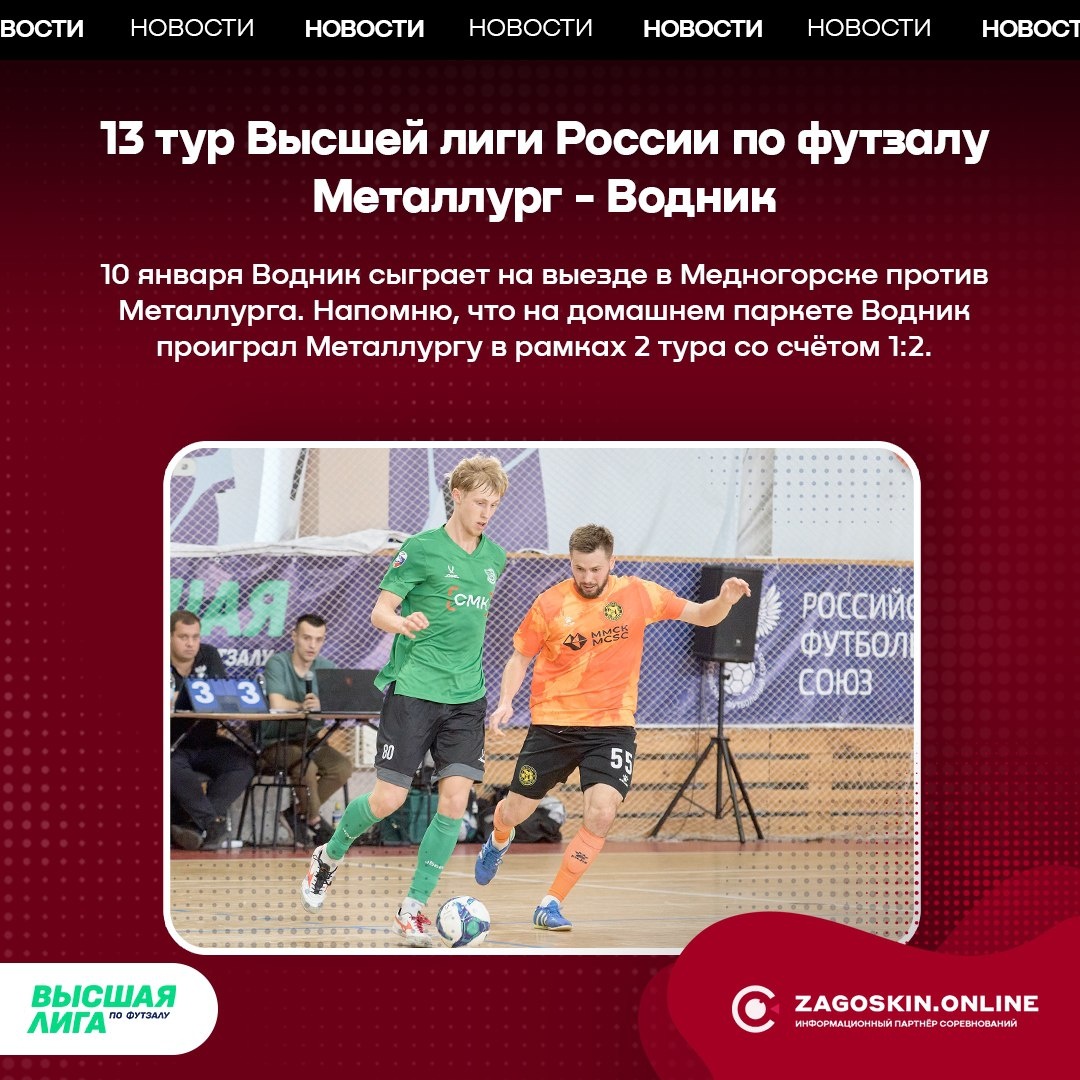 🏆 Завтра 10 января Водник сыграет с Металлургом в рамках 13 тура Высшей лиги России по футзалу