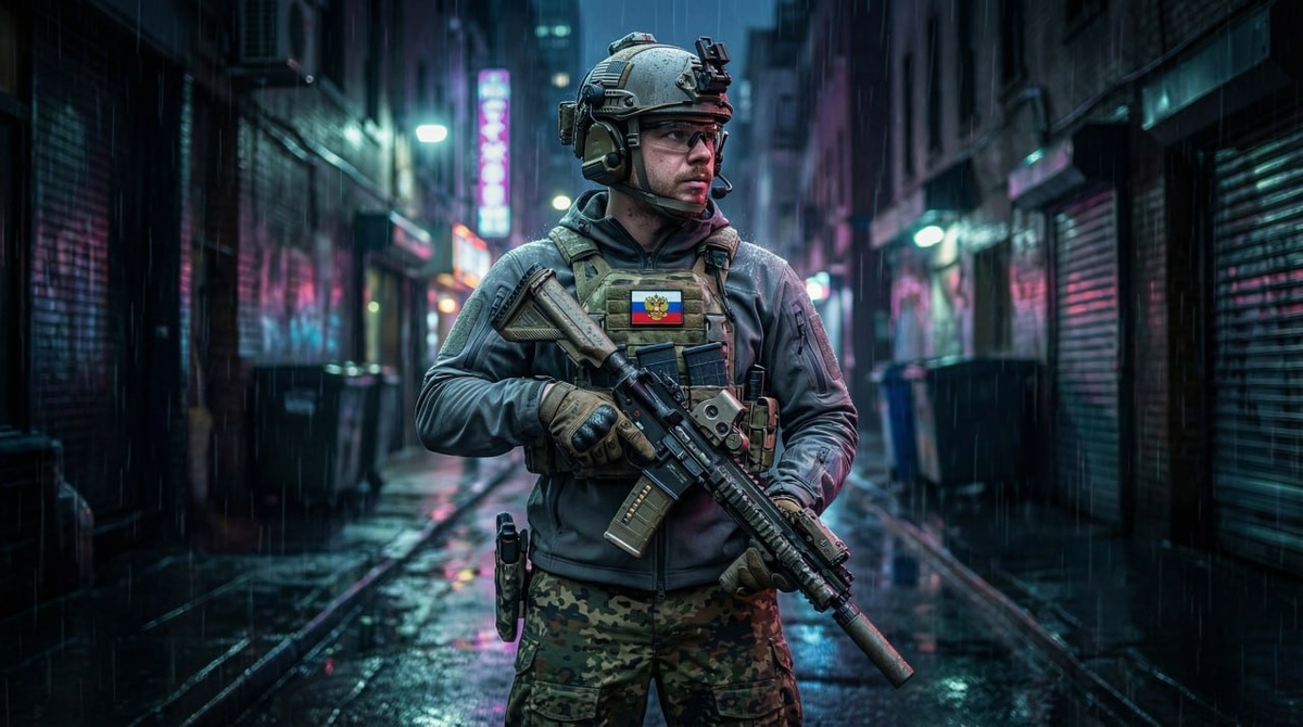 🔠🔠🔠🔠🔠🔠🔠 🦋 Промт для мужиков из серии "Милитари" 1 из 7 Use the uploaded photo to reference your face and appearance. Keeping the facial features and not changing. Keep 100% similarity. Cinematic wide shot of a muscular special forces operator standing in a rain-slicked dark urban alleyway at night, wearing a grey tactical softshell hoodie and Flecktarn camouflage combat pants. Heavy tactical loadout, plate carrier vest with magazine pouches, Russian tcar Petr 1 gerb patch on chest, ballistic helmet with NVG mount and battery pack, comtac headset, tactical glasses, gloved hands holding a customized HK416 assault rifle, drop-leg holster, kneepads, heavy tactical boots. Neon city lights reflecting on wet pavement, rain droplets on gear, moody atmosphere, shallow depth of field, photorealistic, 8k resolution, volumetric lighting, cinematic color grading --ar 16:9 --v 6.0 Заказать промт или фотосессию. ✉️ Буст канала. ⚡️ #нейросеть #aiфотосессия #промтыдляфотографа #мужскойп