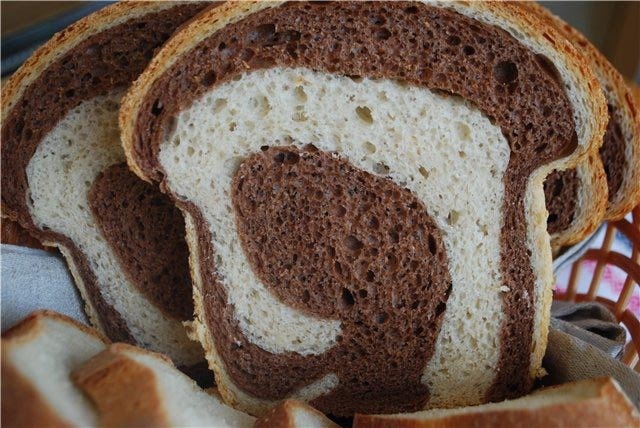 Мука пшеничная- 2 стакана Вода - 190 миллилитров Дрожжи быстродействующие- 3 грамма Сахар - 0.5 столовой ложки Поваренная соль - 0.5 чайной ложки Масло растительное - 1 столовая ложка Мука пшеничная - 1 стакан Ржаная мука - 1 стакан Ржаной солод - 1 столовая ложка Вода - 190 миллилитров Дрожжи быстродействующие - 3 грамма Сахар - 0.5 столовой ложки Поваренная соль - 0.5 чайной ложки Масло растительное - 1 столовая ложка 1. Вначале сделаем темное дрожжевое тесто для будущего мраморного хлеба, так как ржаному тесту желательна более длительная расстойка. Для этого нам понадобятся два вида муки (пшеничная и ржаная), теплая кипяченая вода, сухие активные дрожжи, сахар, соль, рафинированное растительное масло и ржаной солод. 2. Так как мы используем быстродействующие дрожжи, добавляем их сразу в смесь двух видов муки (предварительно просеиваем). Туда же кладем соль, сахарный песок и все перемешиваем. 3. Добавляем ржаной солод. Кстати, солод можно предварительно заварить в 100 мл круто