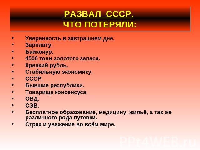 Что потеряли: СССР, несмотря на этническое многообразие, создал феномен «советского народа» – над-этническую общность, скрепленную общей идеологией (со светлыми и темными сторонами), общей исторической судьбой, общим проектом построения «светлого будущего». Это порождало чувство коллективной гордости: за индустриализацию, победу в войне, прорыв в космос, за статус сверхдержавы. Как отмечал М. Задорнов, «дружили, когда интересно», а не по меркантильным соображениям.