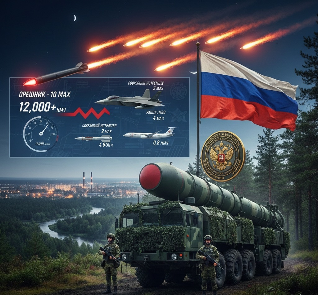 Главная проблема для любого противника — это скорость. «Орешник» летит со скоростью 10 Махов. Чтобы вы понимали масштаб: это больше 12 000 километров в час. Это значит, что от момента запуска из центральной России до любой европейской столицы ракета долетает быстрее, чем вы успеете допить чашку чая.