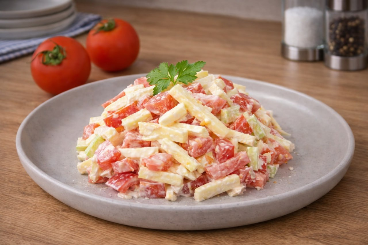 Здравствуйте, мои хорошие! Иногда самые удачные рецепты рождаются буквально на ходу. Открыл холодильник, посмотрел, что осталось, соединил — и вдруг понимаешь, что получилось что-то неожиданно вкусное. Вот этот салат именно такой. Простой до невозможности, без редких ингредиентов и сложных заправок, но с очень интересным, свежим вкусом. Готовится за считанные минуты, а съедается ещё быстрее. Этот салат я особенно люблю делать в те дни, когда не хочется тяжёлой еды. Он лёгкий, сочный, с приятной кислинкой яблока и мягкой сливочностью сыра. Помидор даёт сочность, чеснок — характер, а сметана аккуратно всё связывает. Получается очень домашне, ненавязчиво и при этом не скучно. Такой салат хорош и как самостоятельное блюдо, и как дополнение к обеду или ужину. Ингредиенты: Как приготовить: 1. Начинаем с помидора. Выбирайте спелый, но плотный, чтобы он держал форму и не превратился в кашу. Моем его, обсушиваем и нарезаем небольшими брусочками. Если помидор очень сочный, можно слегка удалить