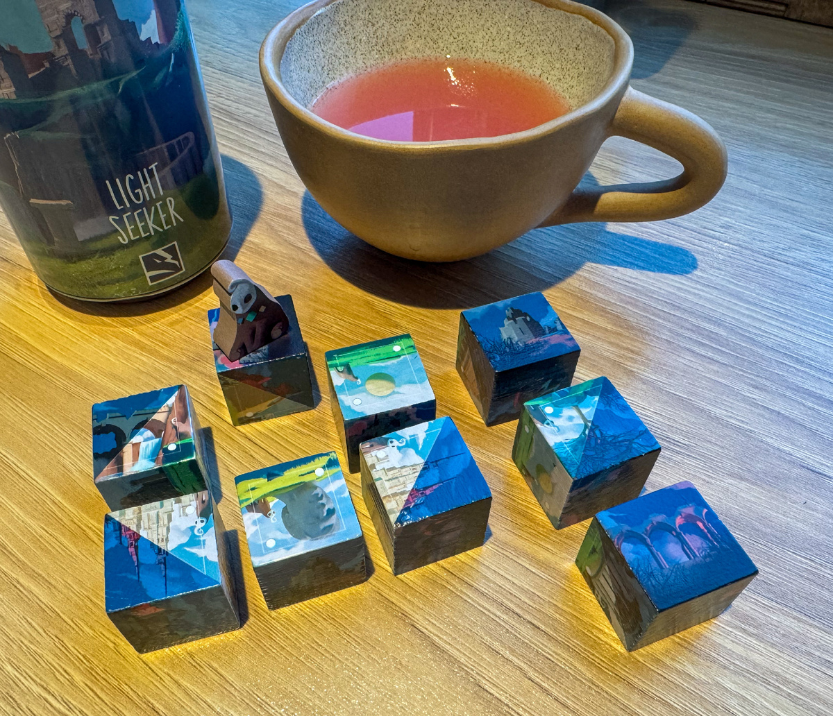 В игре 9 кубиков и фигурка Буха — того самого искателя света, о котором идёт речь в названии игры.