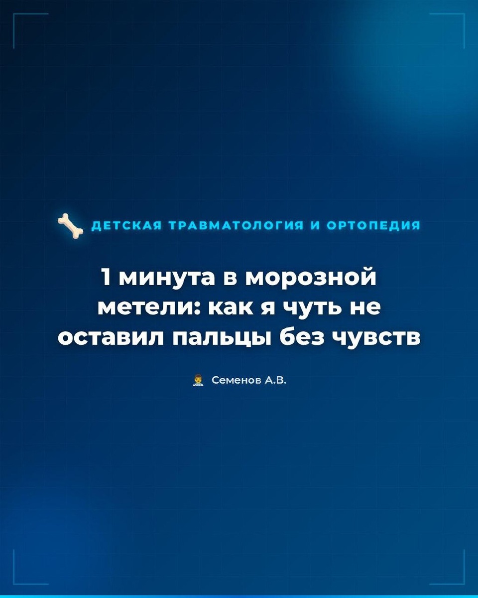 #обморожение 👋 Привет, друзья! На связи Андрей Семенов. 👨⚕️ ❄️ Сегодня выхожу на дежурство утром: ранне утро, мороз, метель стеной. 🎿 В одной руке — гружёный чехол со сноубордом и оборудованием, ведь завтра сразу после смены еду на гору. 🧤 Перчатки? Не, не слышал - я же "быстренько". Пальцы сжимают ручку чехла до побелевших костяшек - эквип тяжелый, защита, борд, костюм, ботинки и так далее. ⚡️ Проходит меньше 60 секунд — и кончики пальцев будто выключили: онемение, «дерево», резкая колющая боль. ⚠️ Ещё минута — и это было бы полноценное обморожение, а не просто тревожный звоночек. ❓ Так сколько времени РЕАЛЬНО нужно, чтобы получить обморожение? 📊 Факты: при -20°C и ветре 10–15 м/с обморожение открытых участков возможно за 5–10 минут ⚠️ 💨 Ветер — ключевой фактор: он сдувает тёплый слой воздуха у кожи и ускоряет охлаждение в разы. ⚡️ При -20°C и сильном ветре ощущаемая температура падает до -40°C по индексу ветроохлаждения. 🛠 Плюс контакт с металлом/пластиком и сжатие паль