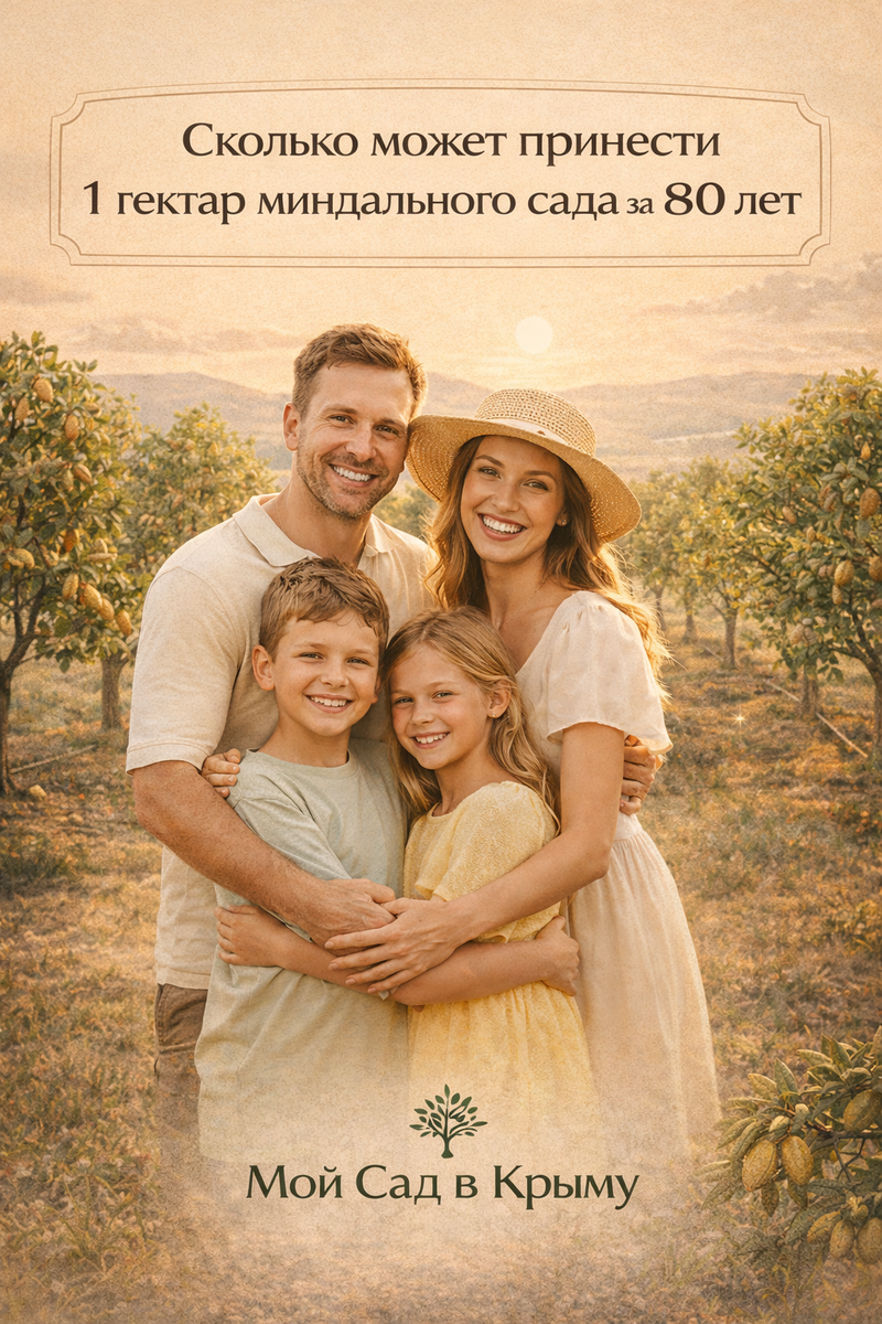 Земля и сад — это расчёт на десятилетия. Проект «Мой Сад в Крыму» — именно такой формат. Зрелое миндальное дерево даёт: Берём средний сценарий — 10 кг. 👉 250 деревьев × 10 кг = 2 500 кг/год Средняя цена сырого миндаля: ≈ 750 ₽/кг