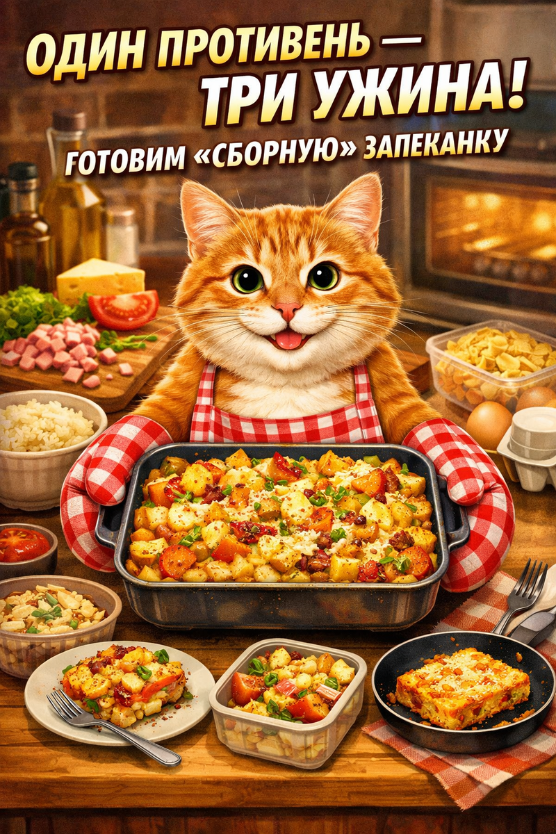 Есть такая кухня, которую никто не фотографирует для соцсетей, но именно она спасает будни: холодильник с «чуть-чуть» всего, усталость после дня, и желание поесть нормально, а не «чай с печенькой и разочарованием». Вот тут и появляется главный герой — один противень, одна большая “сборная” запеканка и сразу три ужина (или два ужина + обед в контейнер). Без весов, без «добавьте 37 граммов», без страха «не так нарежу — не получится».