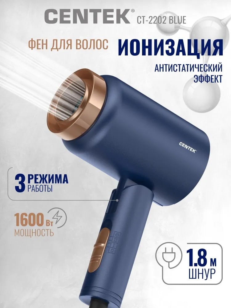 Фен для волос CENTEK CT-2202 Blue 1600Вт, 3 скорости, турмалиновая ионизация, антистатический эффект
