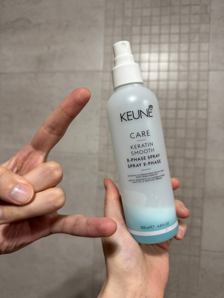 Keune Keratin Smooth 2 Phase Spray - двухфазный спрей с кератином для гладкости волос и контроля пушистости. ➕Волосы мягкие и гладкие без утяжеления ➕Убирает электризацию, я зимой все время его наношу ➕Лёгкий, не липкий, без фиксации ➖Легкая термозащта для фена хорошо, для плойки недостаточно ➖Нужно взбалтывать Оставьте 👍 если ждете следующий обзор #стайлинг@lenabikhair