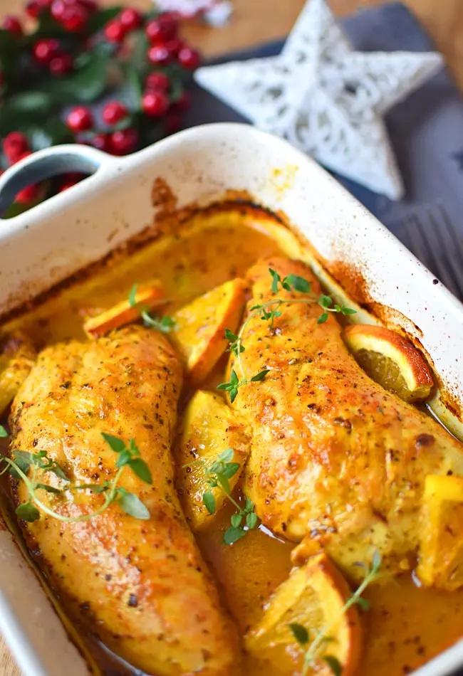 Влейте маринад. Накройте миску пищевой пленкой и поставьте в холодильник на 30 минут. Разогрейте духовку до 180 градусов. Нарежьте дольки апельсина на четвертинки. Выньте индейку из холодильника и выложите в форму для запекания. Залейте маринадом и покройте апельсинами. Поставить в духовку и выпекат