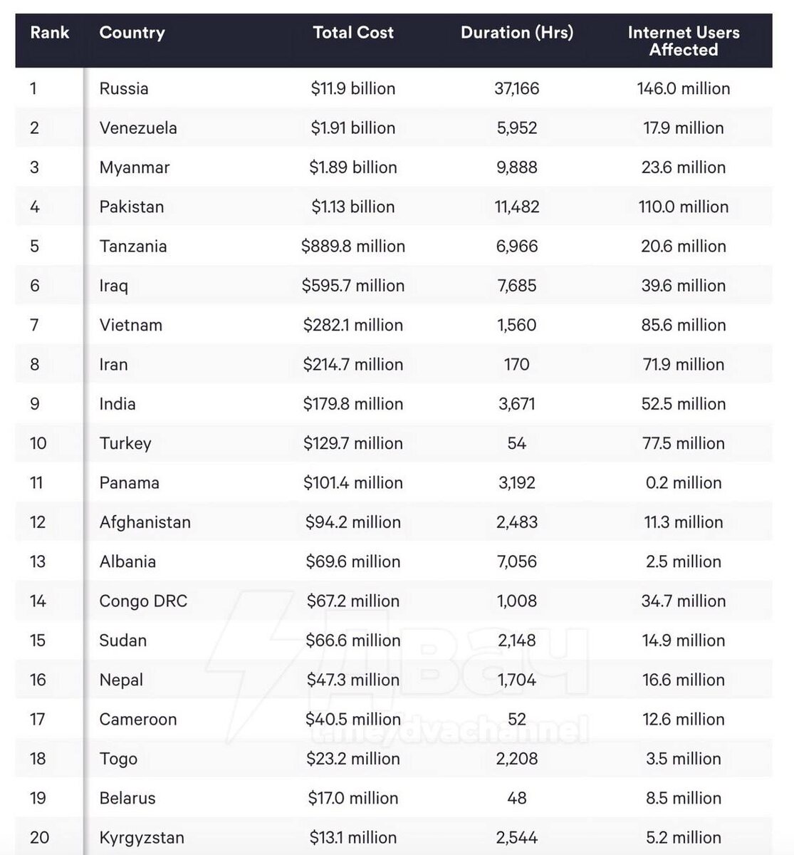 ΠΠΎ ΠΈΡΠΎΠ³Π°ΠΌ 2025 Π³ΠΎΠ΄Π° ΡΡΠΌΠΌΠ°ΡΠ½Π°Ρ ΠΏΡΠΎΠ΄ΠΎΠ»ΠΆΠΈΡΠ΅Π»ΡΠ½ΠΎΡΡΡ ΠΎΡΡΡΡΡΡΠ²ΠΈΡ ΡΠ²ΡΠ·ΠΈ Π² ΡΡΡΠ°Π½Π΅ ΡΠΎΡΡΠ°Π²ΠΈΠ»Π° 37 166 ΡΠ°ΡΠΎΠ². ΠΠΎ ΠΎΡΠ΅Π½ΠΊΠ°ΠΌ, ΡΡΠΎ Π½Π°Π½Π΅ΡΠ»ΠΎ ΡΠΊΠΎΠ½ΠΎΠΌΠΈΠΊΠ΅ ΡΡΠ΅ΡΠ± Π² ΡΠ°Π·ΠΌΠ΅ΡΠ΅ 11,9 ΠΌΠ»ΡΠ΄ Π΄ΠΎΠ»Π»Π°ΡΠΎΠ². ΠΠ° Π²ΡΠΎΡΠΎΠΌ ΠΌΠ΅ΡΡΠ΅ ΠΎΠΊΠ°Π·Π°Π»Π°ΡΡ ΠΠ΅Π½Π΅ΡΡΡΠ»Π°, Π³Π΄Π΅ ΠΈΠ½ΡΠ΅ΡΠ½Π΅Ρ Π±ΡΠ» Π½Π΅Π΄ΠΎΡΡΡΠΏΠ΅Π½ 5 952 ΡΠ°ΡΠ° β ΠΏΠΎΡΡΠΈ Π² ΡΠ΅ΡΡΡ ΡΠ°Π· ΠΌΠ΅Π½ΡΡΠ΅. Π’Π°ΠΊΠΈΠΌ ΠΎΠ±ΡΠ°Π·ΠΎΠΌ, Π ΠΎΡΡΠΈΡ Π·Π½Π°ΡΠΈΡΠ΅Π»ΡΠ½ΠΎ ΠΎΠΏΠ΅ΡΠ΅Π΄ΠΈΠ»Π° Π΄ΡΡΠ³ΠΈΠ΅ ΡΡΡΠ°Π½Ρ ΠΏΠΎ ΠΌΠ°ΡΡΡΠ°Π±Π°ΠΌ ΠΈΠ½ΡΠ΅ΡΠ½Π΅Ρ-ΠΎΡΠΊΠ»ΡΡΠ΅Π½ΠΈΡΠΌ. ΠΠΎΡΠΊΠ²Π°. ΠΠΎΠ²ΠΎΡΡΠΈ 24/7