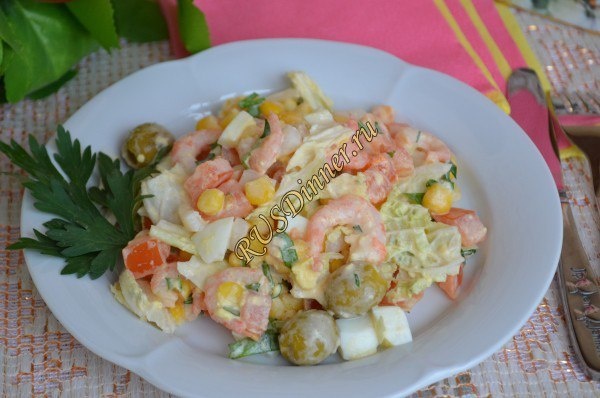 » От автора: Салат «Светофор» обычный салат из серии "с кукурузой", его изюминкой являются креветки. Ингредиенты: Салат китайский - 1 кач. (хватит 7 листов) Петрушка - 1 пуч. Оливки с анчоусом - 1 б. Кукуруза консервированная - 1 б. Помидоры - 200 гр. Яйцо - 3 шт. Кальмар тушка - 200 гр. Креветки - 120 гр. (очищенные и отварные) Соль - 5 гр. Перец черный молотый - 5 гр. Майонез - 50 гр. Источник: https://rusdinner.ru/page/salat-svetofor