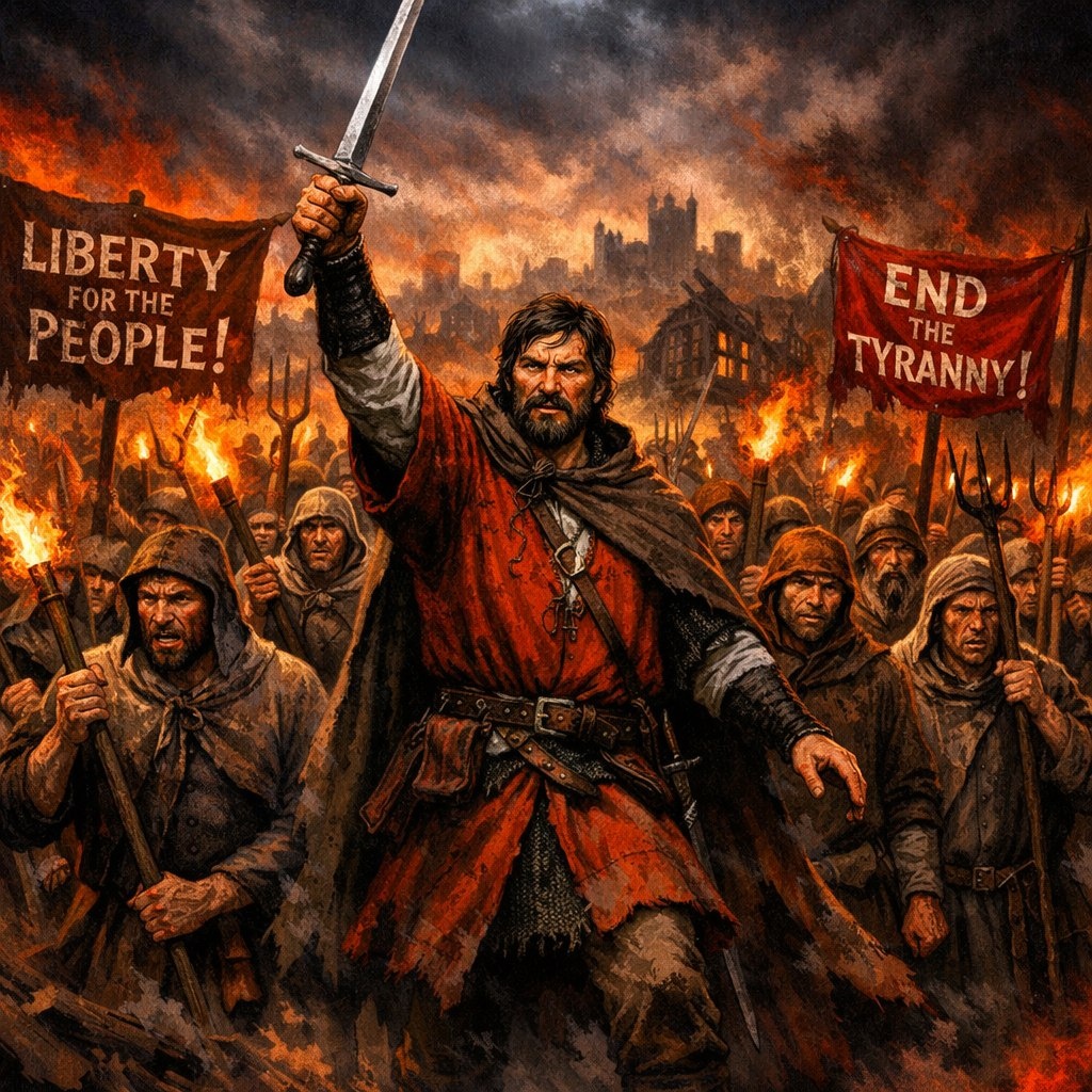 Толпы крестьян идут на Лондон Представьте: Англия, 1381 год. По дорогам к Лондону движется армия. Но это не рыцари в сияющих доспехах — это измождённые крестьяне с вилами и косами. Во главе — харизматичный Уот Тайлер.