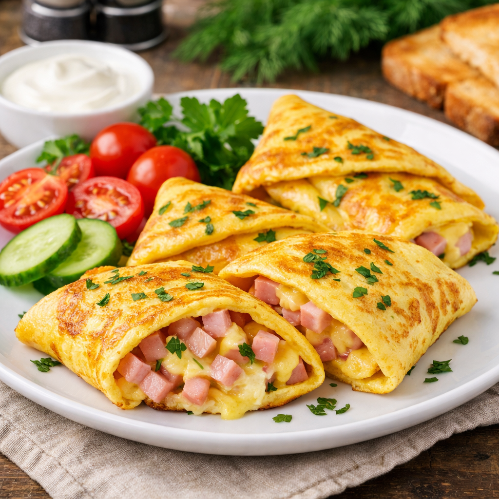 · Экспериментируйте с начинкой: Вместо ветчины можно использовать отварную курицу, грибы, шпинат, сладкий перец или томаты (их лучше предварительно немного обжарить, чтобы ушла лишняя влага).