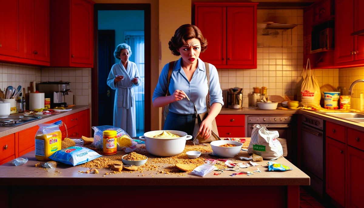 На столе - крошки, грязные тарелки, открытая банка майонеза, на плите убежавший суп, на полу - липкие следы. В раковине - башня из посуды.