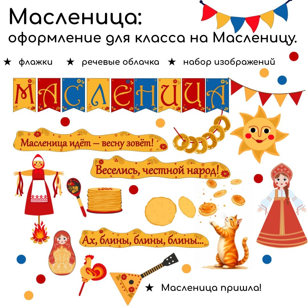 И мы подготовили оформление на Масленицу. Оформление подойдёт для создания праздничной атмосферы в классе, школьном холле или