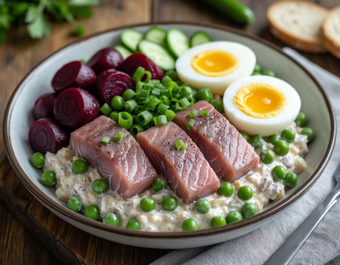 Свекольный салат с солёной сельдью — классическое блюдо скандинавской кухни. Нежный вкус свёклы и яиц гармонично сочетается с пикантной сельдью, а горошек придаёт приятную текстуру и сладость.