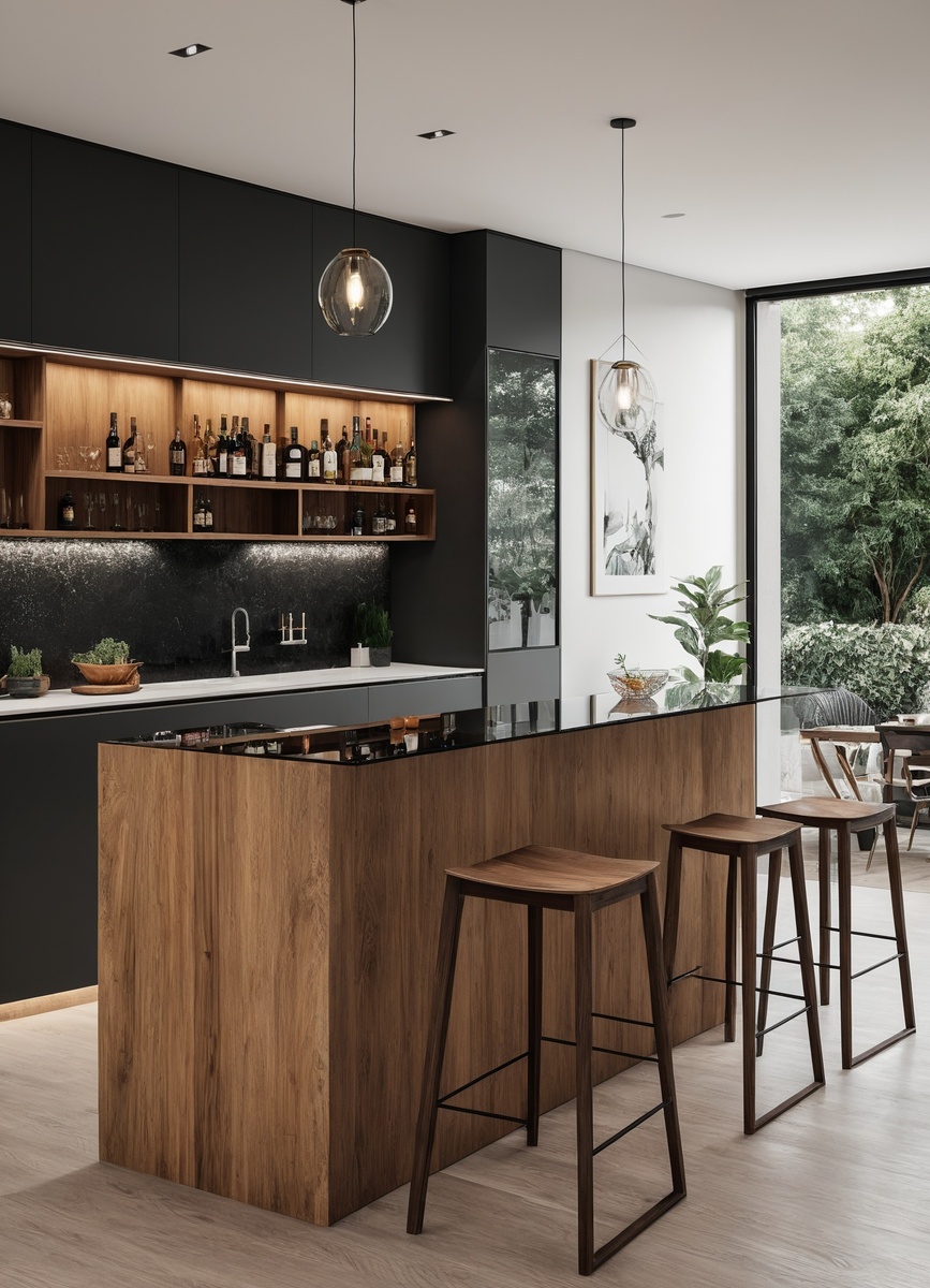 Барная стойка может стать фокусной точкой кухни, если правильно сочетать её с другими элементами. Используйте контрастные материалы - дерево для стойки и металл для стульев, что добавит динамики. Также стоит рассмотреть использование открытых полок над стойкой для хранения бокалов и аксессуаров, что создаст уникальный стиль. Не забывайте о декоре: живые растения или стильные картины придадут уют и индивидуальность.