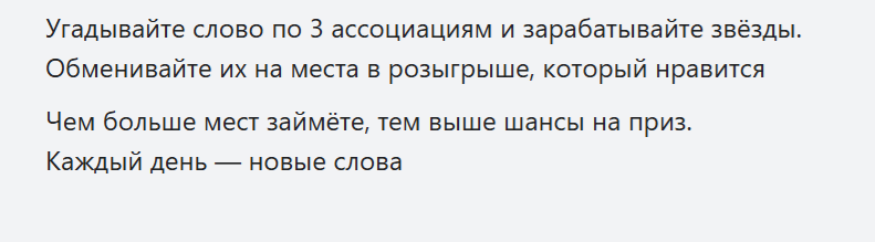 Чтобы выиграть желанный приз, участвуйте ежедневно, отгадывайте ассоциации и собирайте звезды. Чем больше звезд накопите, тем лучше будут ваши шансы на крупный выигрыш! 1. Аккумулятор, Ток, Энергия Общее слово: заряд 2. Знак, Буква, Герб Общее слово: символ 3. Гравитация, Магнит, Сила Общее слово: притяжение Навык, Опыт, Знание Общее слово: умение Еда Полдень Перерыв Общее слово: обед Зрелость, Этап, Подросток Общее слово: молодость Поэт, Свитер, Гитара