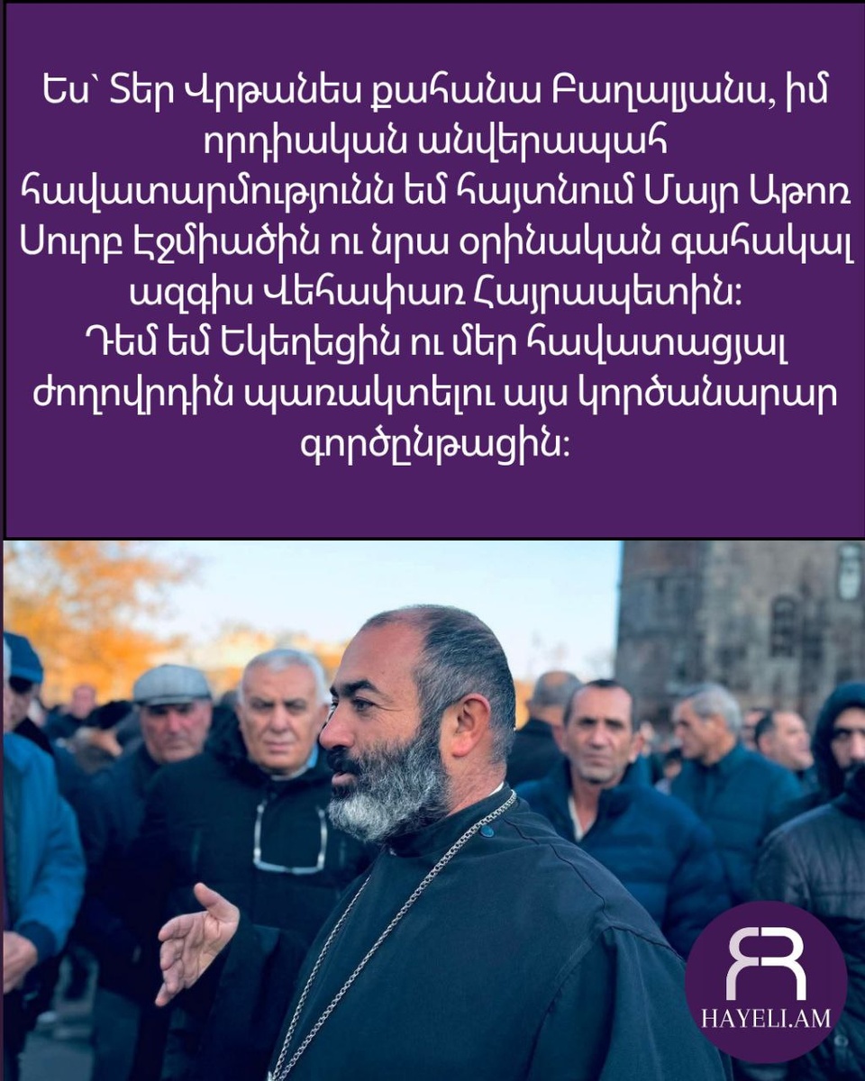 Ես` Տեր Վրթանես քահանա Բաղալյանս, իմ որդիական անվերապահ հավատարմությունն եմ հայտնում Մայր Աթոռ Սուրբ Էջմիածին ու նրա օրինական գահակալ ազգիս