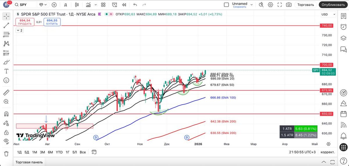 В моменте $ES1! уверенно пробивает юбилей 7 000$ и обновляет исторический максимум, и сегодня весь рынок растет — просто прекрасно! Давайте более подробно попробуем разобраться, как обычно, в воскресенье. А пока наслаждайтесь тем, как растет прибыль без вашего участия! И не говорите, что не хотите также. По крипте всё так же: была попытка пойти вверх (нужно было бы наказать шортистов), но как говорил, сверху слишком много скользящих, и каждая из них сопротивление. Если пробьет — отлично, если захочет снизиться еще раз — тоже неплохо. Но я всегда за «бычку»! Девятый день нового года, а столько всего произошло. Но это никак не влияет на фондовый рынок США 🇺🇸. И мы этим пользуемся, а не поддаемся панике из-за ситуации в мире. Всем отличных выходных… Хотя, наверное, уже устали отдыхать. Тогда выходите из запоя и приступайте к делу! #spy #технический_анализ #америка #трейдинг_сша #фондовый_рынок #обзор #вывод #qqq #vix #smh #mags #xlk #ixic #крипта #btc