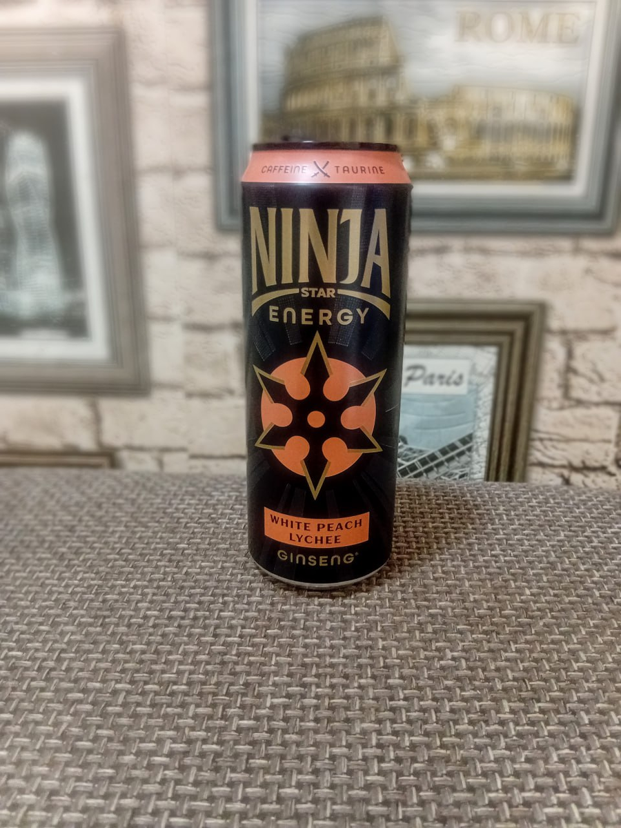 Привет! Продолжаем исследовать полки магазинов в поисках необычных вкусов. Сегодня у нас на обзоре фруктовый "ниндзя" — Ninja Star Energy со вкусом White Peach Lychee (Белый Персик Личи). Сможет ли этот экзотический дуэт порадовать или оставит смешанные впечатления? Давайте пробовать. Очень личи-ориентированный вкус с легкой персиковой нотой. Послевкусие личи слишком насыщенное, что может не всем понравиться. За свою цену по акции в 60 рублей — вполне достойный вариант для любителей личи, но за полную стоимость не оправдан. Лучше, чем земляничный Ninja Star, и вполне сойдет как лёгкий лимонад. Стильная черная матовая банка, верхняя часть которой окрашена в нежный персиковый оттенок. Основной логотип "NINJA STAR ENERGY" выполнен золотистым шрифтом, а ниже расположен крупный, ярко-оранжевый стилизованный сюрикен. Дизайн выглядит современно, динамично и привлекает внимание своим контрастом и экзотическими цветами. В аромате чувствуется приятное сочетание персика и личи. Персик придает с