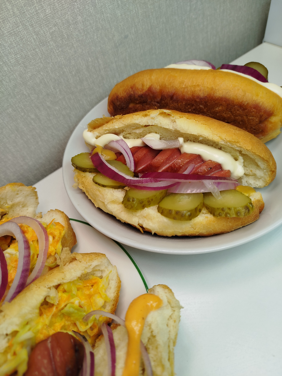 Булочку погреть, сосиски пожарить. Салат Коул слоу выкладываем на одну половину булочки и немного полукольцами красный лук, на левую половинку сосиску, украсить кетчупом и майонезом .