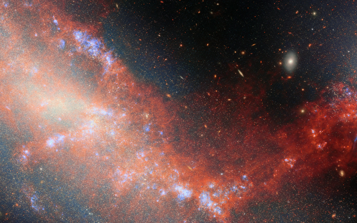 Может показаться, что на новом снимке Джеймса Уэбба находится какая-нибудь продолжительная туманность или скопление. Но на самом деле тут запечатлено слияние двух карликовых галактик NGC 4490 и NGC 4485, расположенных на расстоянии около 24 млн световых лет от Земли в созвездии Canes Venatici. Эти галактики гораздо меньше Млечного Пути, в них мало элементов тяжелее гелия, мало газа и звезд. NGC 4490 — более крупный объект, занимающий левую часть снимка, NGC 4485 — это меньшая галактика, расположенная в правой части снимка. Между ними виден отчетливый «мост», по которому идет передача газа и пыли. Примерно 200 млн лет назад галактики приблизились друг к другу, а затем разошлись. NGC 4490 успела щипнуть поток газа из своей соседки и теперь тянет его к себе, создавая ощущение, будто галактики пожимают друг другу руки. Взаимодействие привело к появлению новых звезд и скоплений вдоль недавно образовавшегося газового моста и внутри двух галактик. Их можно узнать по областям ярко-синего цвета