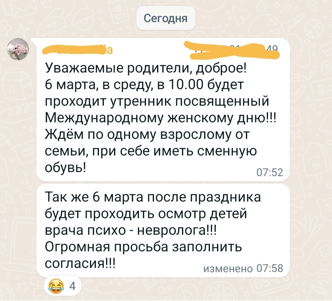 В итоге мы сошлись во мнении, что родительский чат — это, безусловно, удобство для родителей. Возможность быть в курсе всего, что происходит в школе, задать вопрос в любой момент. Но для учителей это постоянный стресс, лишняя нагрузка и бесконечный источник головной боли. Почему-то такие нюансы редко озвучивают вслух и предпочитают делать вид, что все хорошо.