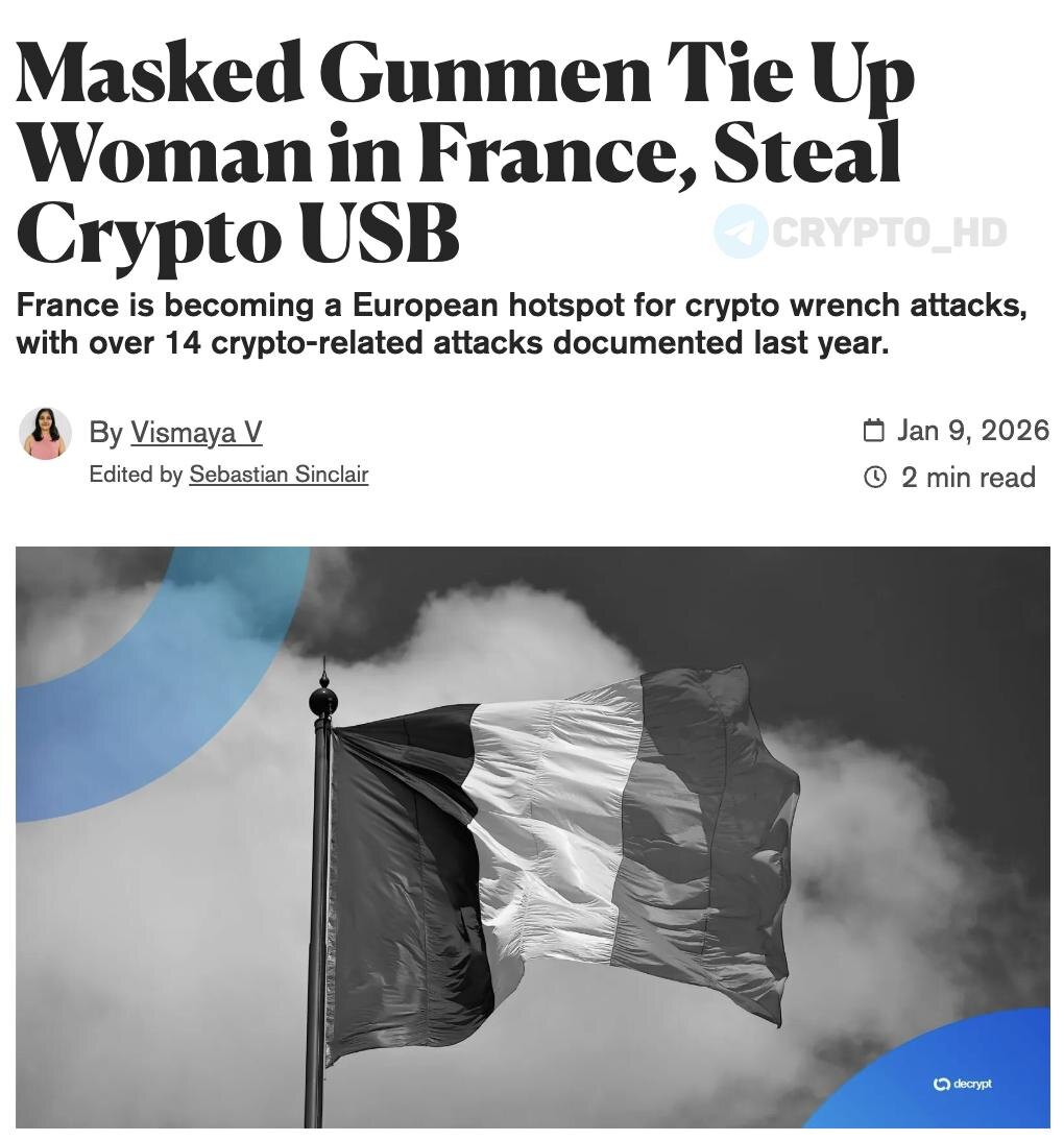 ! Трое вооруженных людей в масках ворвались в дом в Маноске, связали женщину и украли USB-накопитель с криптоданными ее партнера. Нападавшие действовали быстро и целенаправленно. Их интересовали не наличные, а доступ к криптоактивам. ✦ За прошлый год во Франции зафиксировано 14 «гаечных атак». ✦ Всего по миру их было более 70. ✦ Страна становится европейским хабом насильственных атак на владельцев крипты. «Гаечная атака» (wrench attack) – применение физического насилия или угроз для добычи доступа к цифровым активам. Ранее: - бойфренд Сэма Альтмана - похищение «криптомиллионера» - фейковый Uber - похищение сооснователя Ledger - OnlyFans-модель Amouranth Crypto Headlines