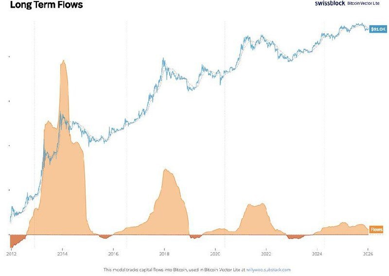 Willy Woo says on-chain data does not yet support the end of $BTC's four-year cycles, according to his analysis. He notes network flows are still declining in line with past cycle behavior.