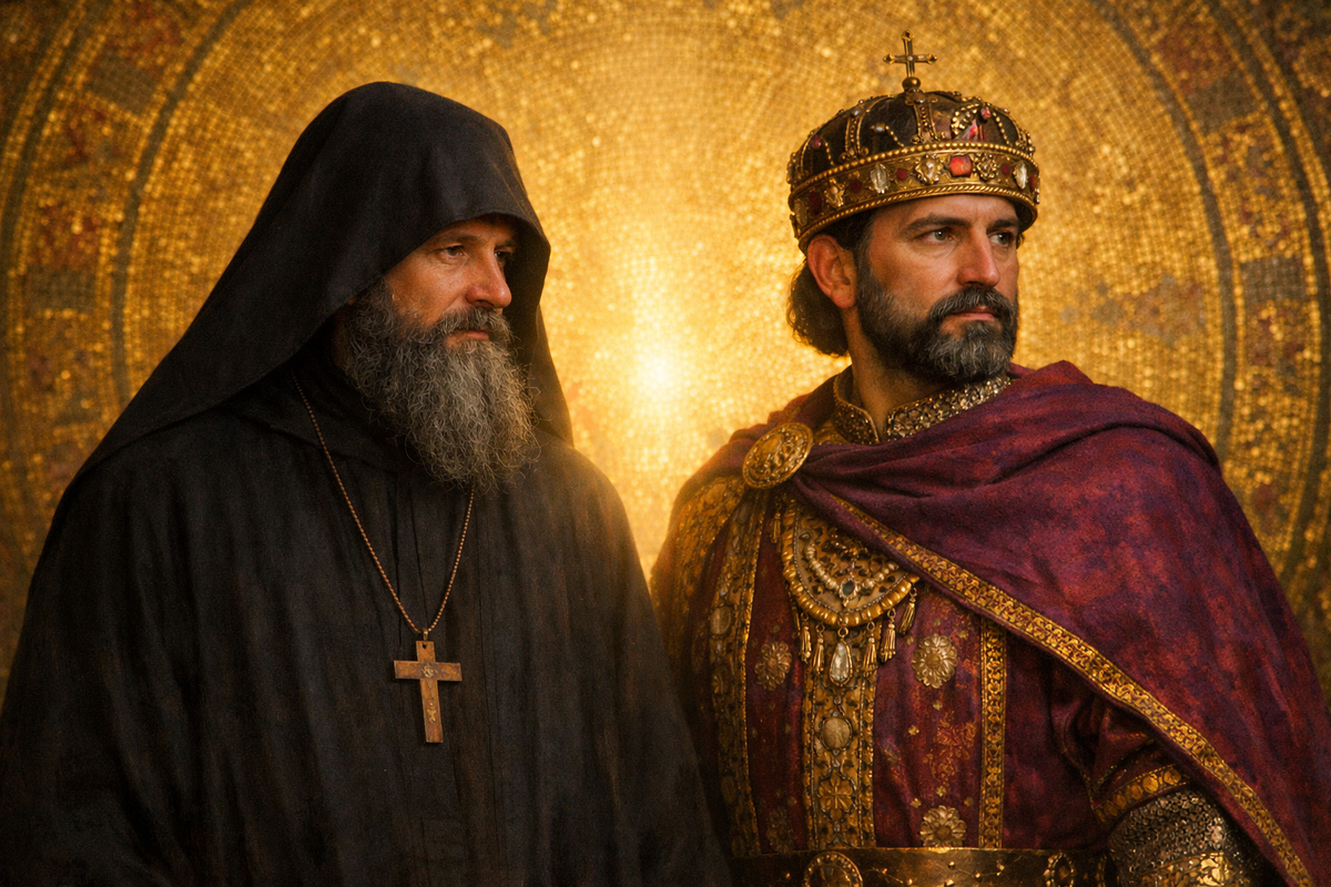 власть — технический инструмент управления. Но византийская традиция мыслила иначе. Для Византии власть и духовность были не врагами и не дубликатами, а двумя различными путями служения, ведущими к одной цели. Эти пути назывались просто: Они никогда не совпадали полностью — и именно поэтому удерживали мир от распада. В византийском христианстве не существовало «двух небес»: Спасение мыслилось единым, но путь к нему — разным. Это не конкуренция, а разделение труда внутри одной цивилизационной модели. Монах в Византии — не беглец от жизни и не отрицатель мира.